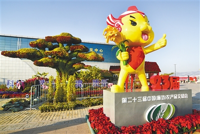 图为第二十三届中国(廊坊)农产品交易会展馆外,吉祥物“廊廊”和“丰收岛”花坛正在进行最后装饰工作。 记者 刘向 摄