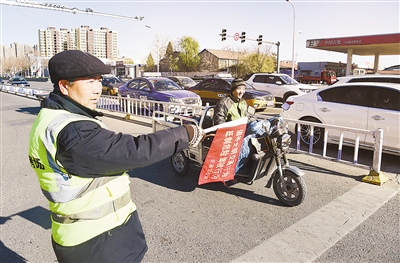 全国文明城市创建以来,市区志愿者们不畏艰辛、引导交通、践行承诺,用自己的实际行动,为创建全国文明城市贡献力量。图为志愿者正在市区南龙道与建设南路交口协助民警疏导交通。《廊坊日报》记者 李泳辰 摄
